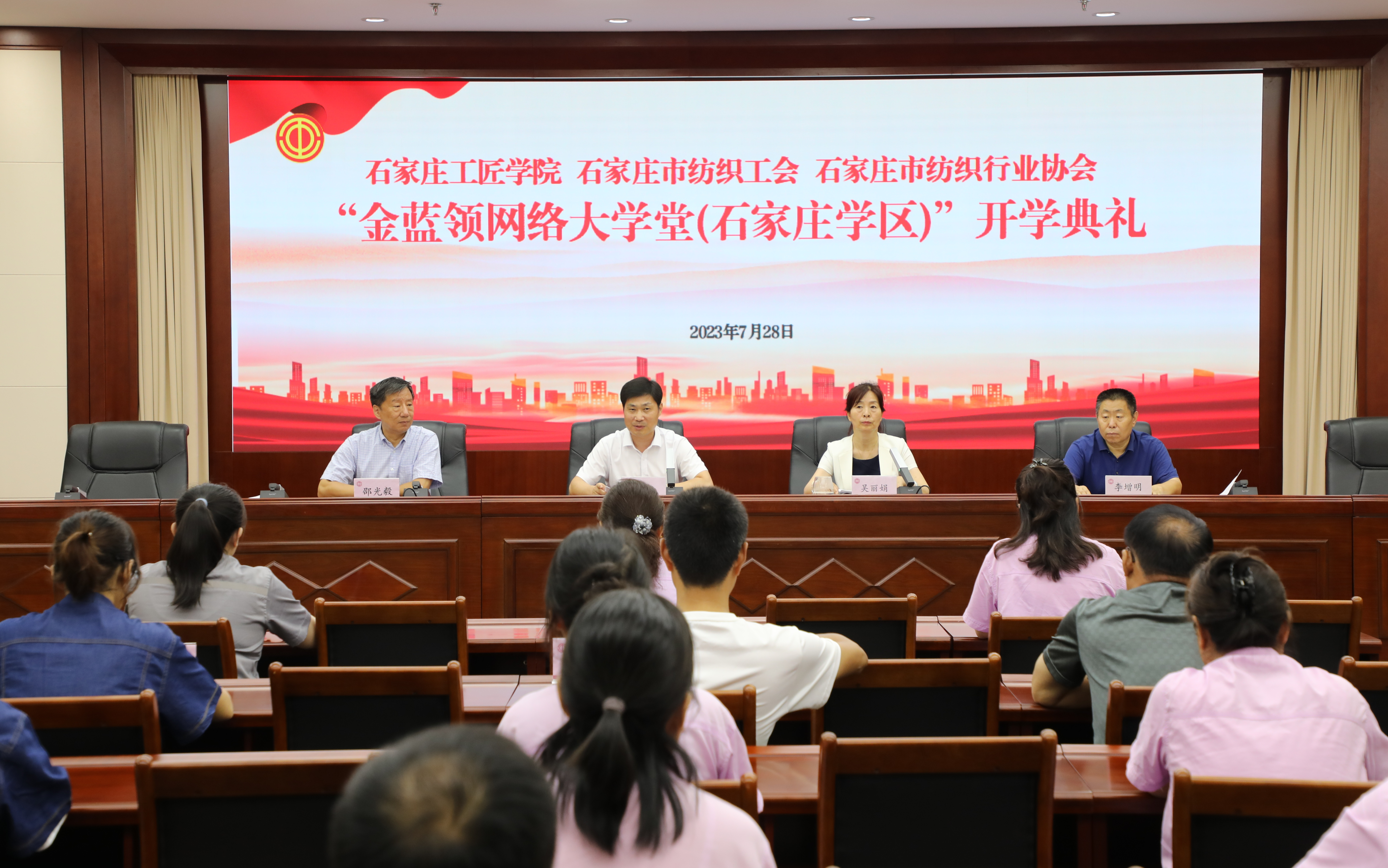 2023年7月28日上午,市紡織工會(huì)、市紡織行業(yè)協(xié)會(huì)、石家莊工匠學(xué)院聯(lián)合舉辦“金藍(lán)領(lǐng)網(wǎng)絡(luò)大學(xué)堂”(石家莊學(xué)區(qū))開學(xué)典禮。石家莊市十家棉紡織企業(yè)的七十余名學(xué)員經(jīng)選撥推薦入學(xué)參加中國財(cái)貿(mào)輕紡煙草工會(huì)、中國棉紡織行業(yè)協(xié)會(huì)舉辦的2023年棉紡織行業(yè)金藍(lán)領(lǐng)網(wǎng)絡(luò)大學(xué)堂。市總工會(huì)黨組成員、副主席、石家莊工匠學(xué)院負(fù)責(zé)人張寶山出席并講話。石家莊市紡織行業(yè)協(xié)會(huì)會(huì)長邵光毅傳達(dá)有關(guān)文件精神,介紹“金藍(lán)領(lǐng)網(wǎng)絡(luò)大學(xué)堂”石家莊學(xué)區(qū)學(xué)員選拔推薦入學(xué)情況。會(huì)議由市總工會(huì)黨組成員、副主席吳麗娟主持。