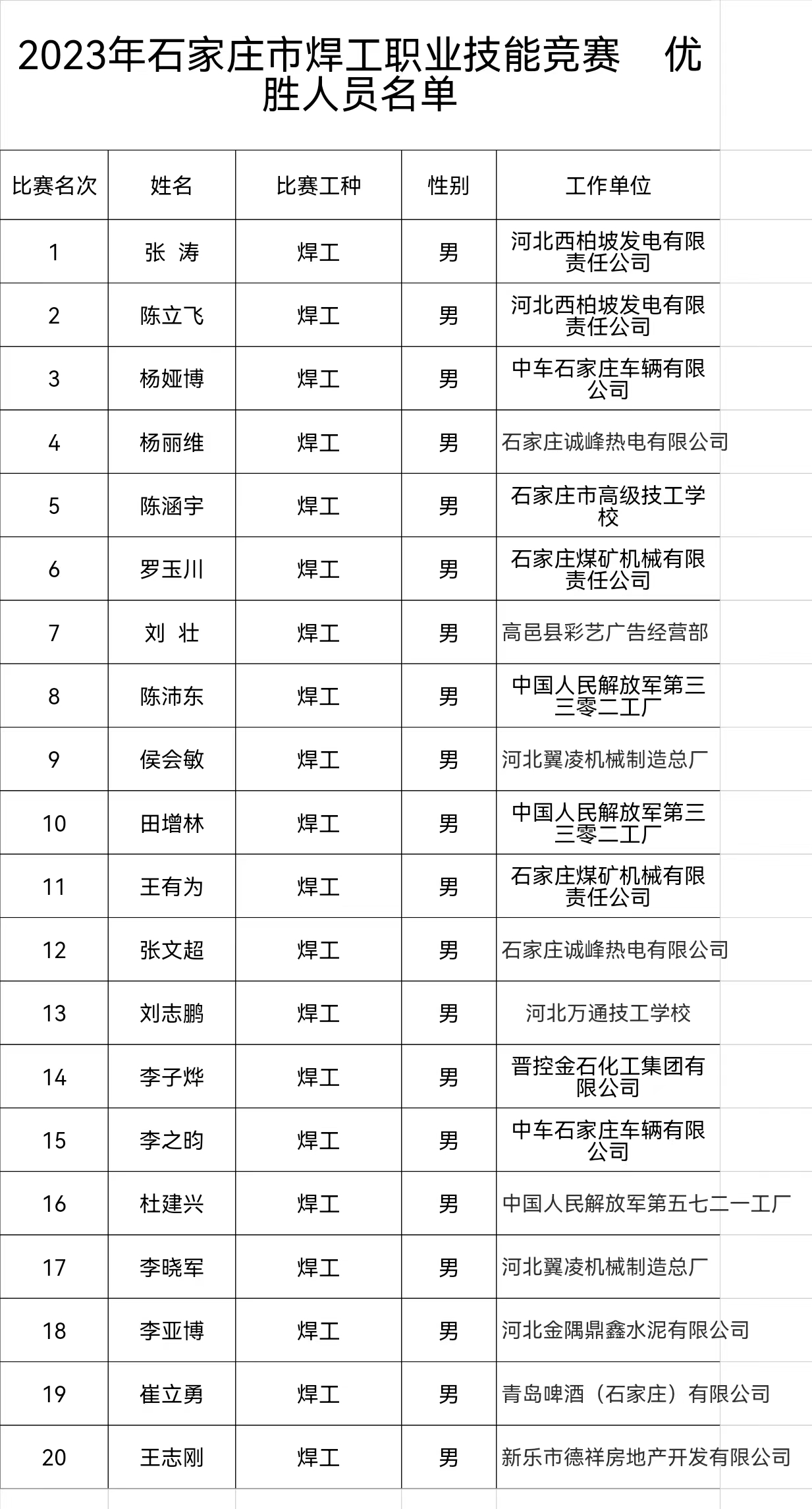 2023年石家莊市焊工職業(yè)技能競賽優(yōu)勝人員名單