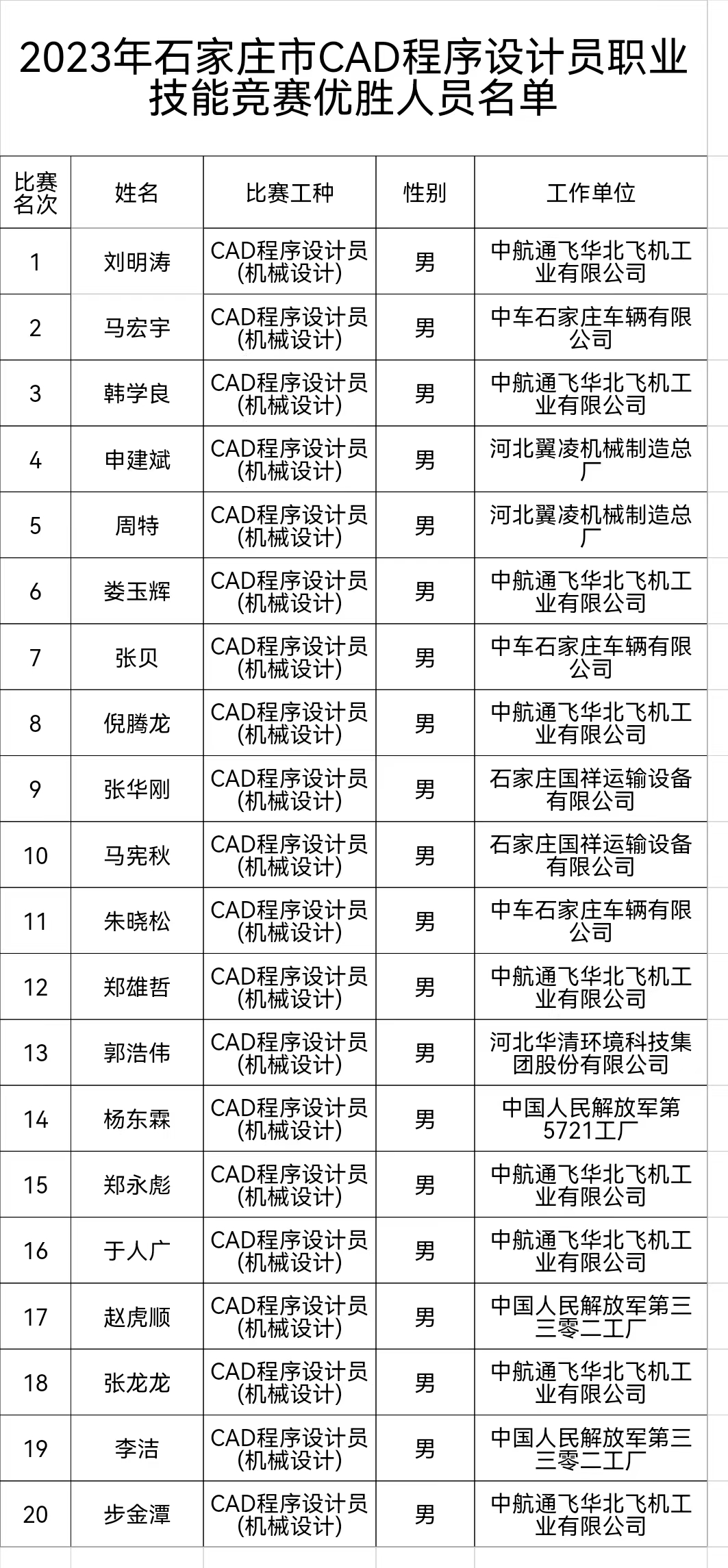 2023年石家莊市CAD程序設(shè)計(jì)員職業(yè)技能競(jìng)賽優(yōu)勝人員名單