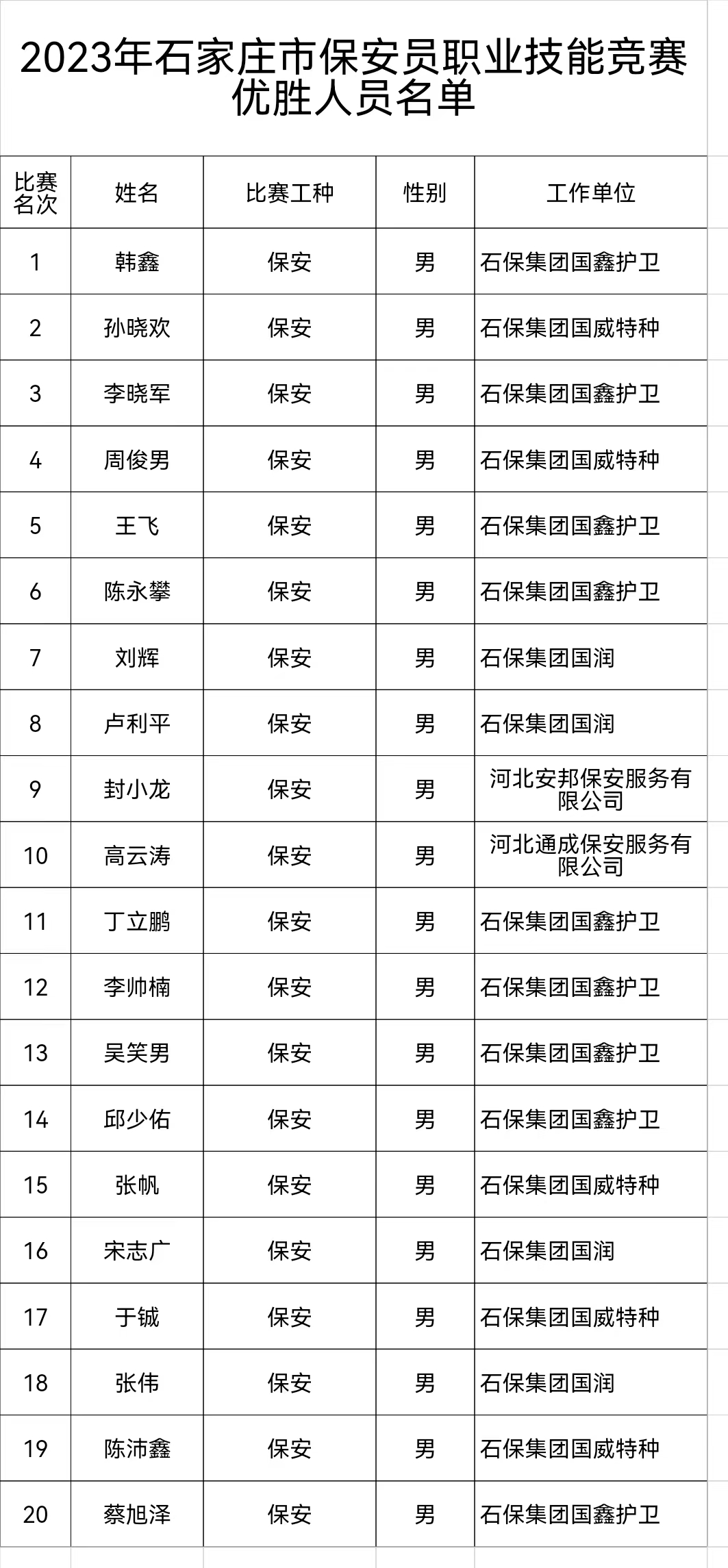 2023年石家莊市保安員職業(yè)技能競賽優(yōu)勝人員名單