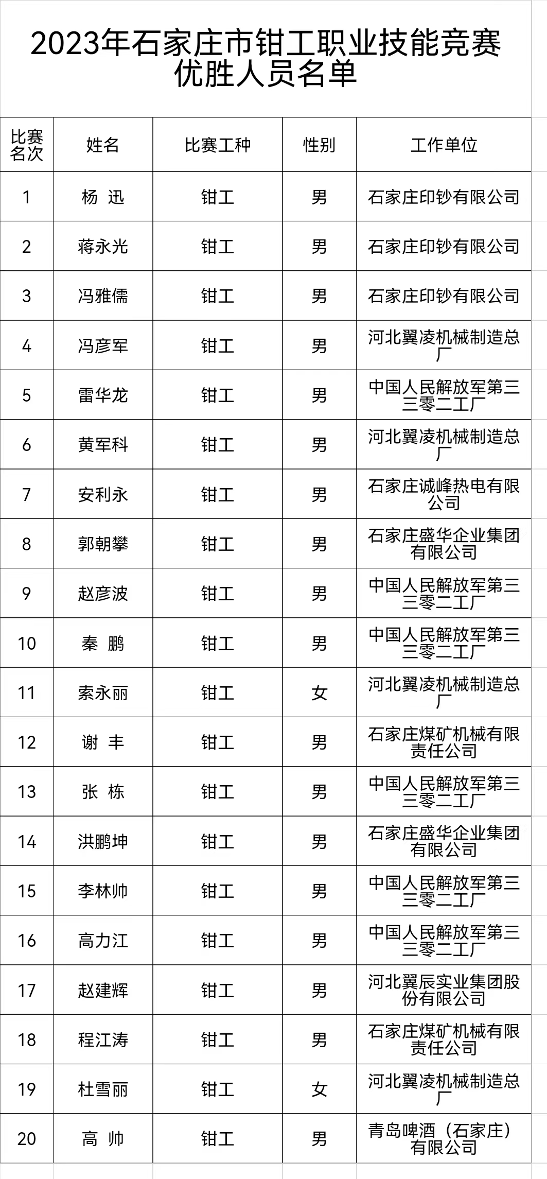2023年石家莊市鉗工職業(yè)技能競(jìng)賽優(yōu)勝人員名單