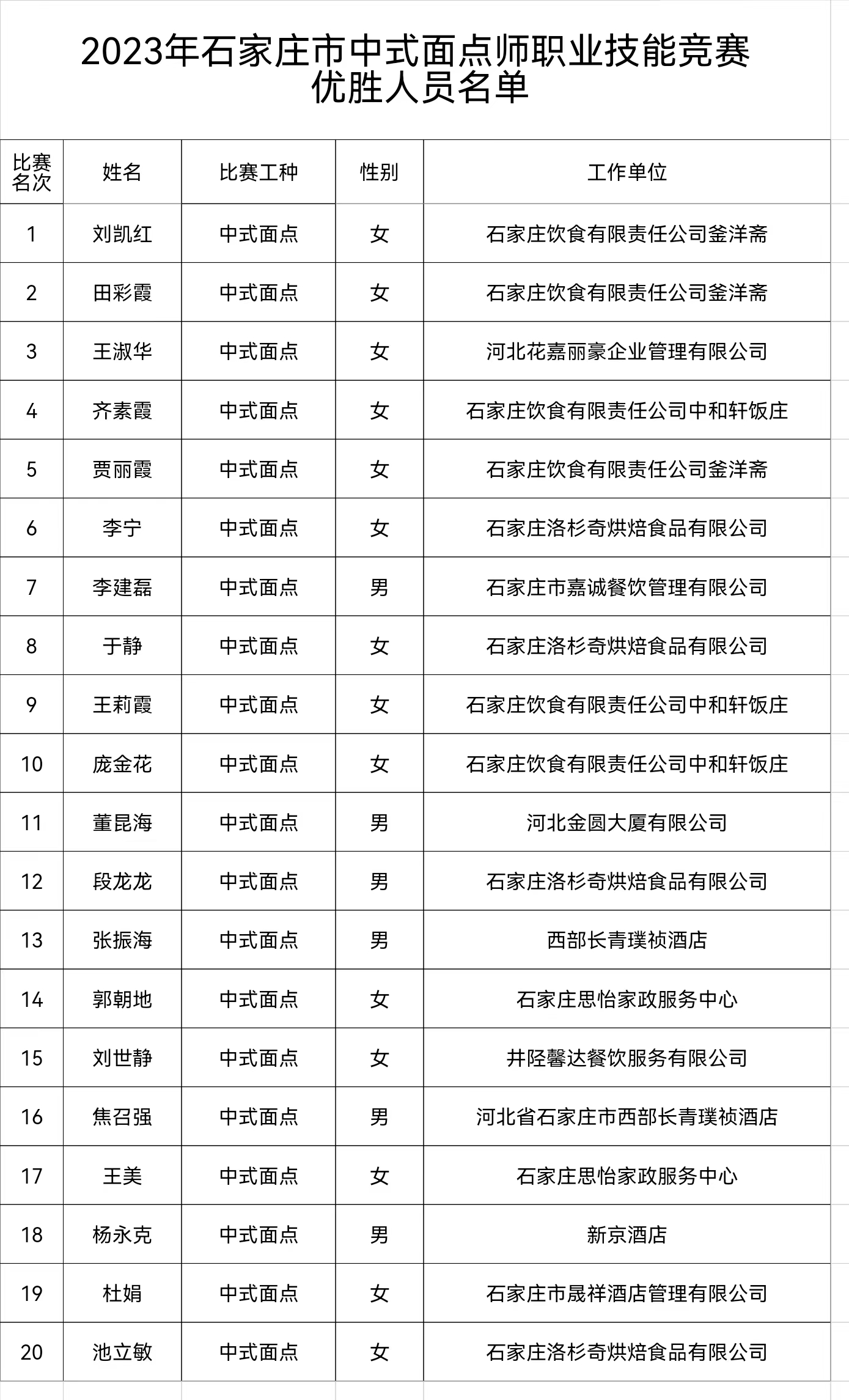2023年石家莊市中式面點(diǎn)師職業(yè)技能競(jìng)賽優(yōu)勝人員名單