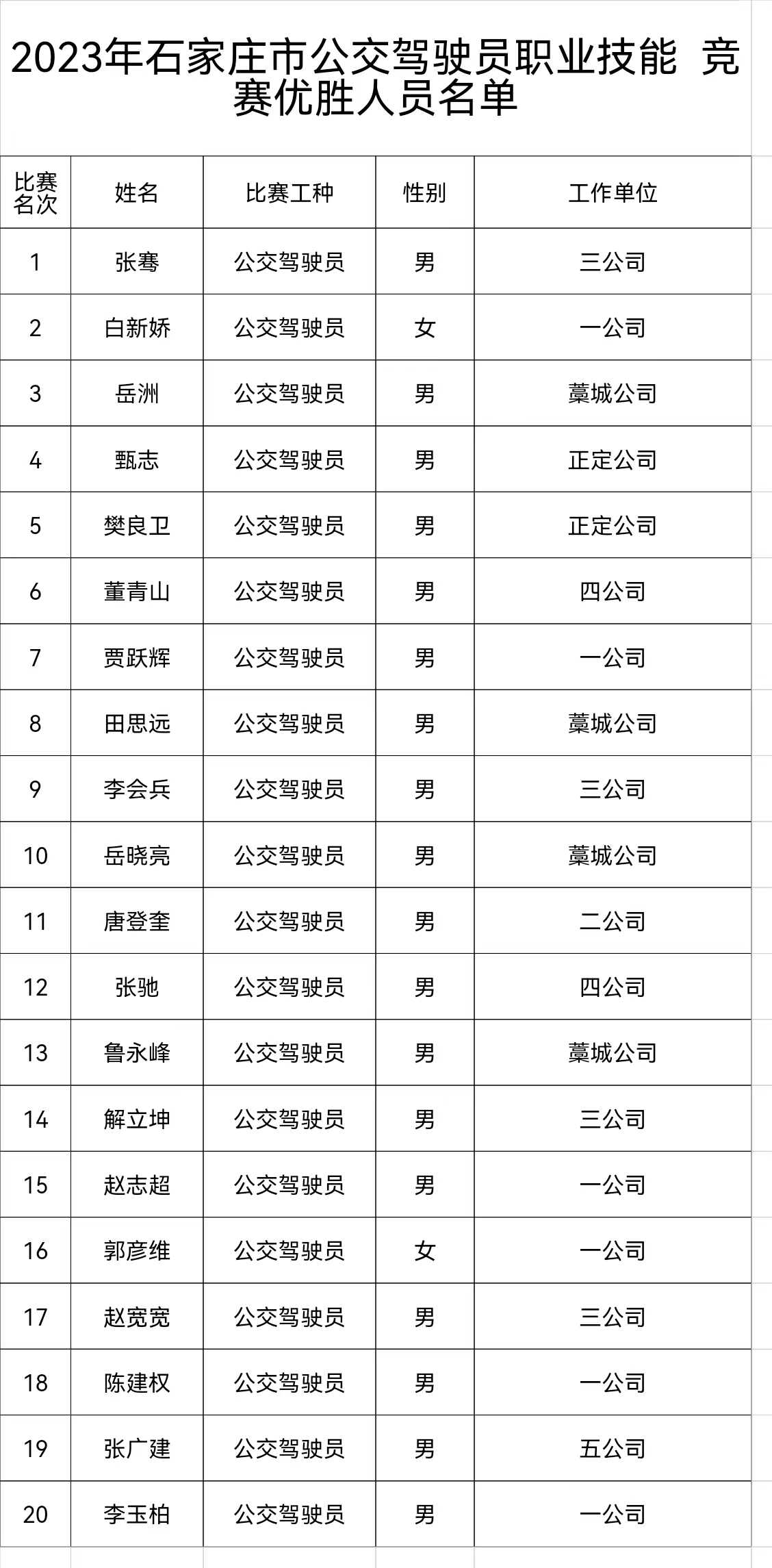 2023年石家莊市公交駕駛員職業(yè)技能競(jìng)賽優(yōu)勝人員名單