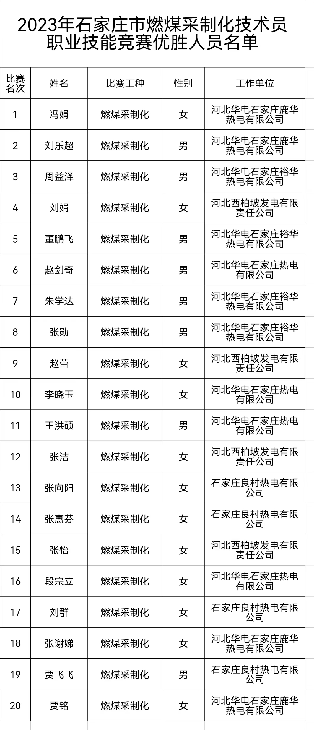 2023年石家莊市燃煤采制化技術(shù)員職業(yè)技能競(jìng)賽優(yōu)勝人員名單
