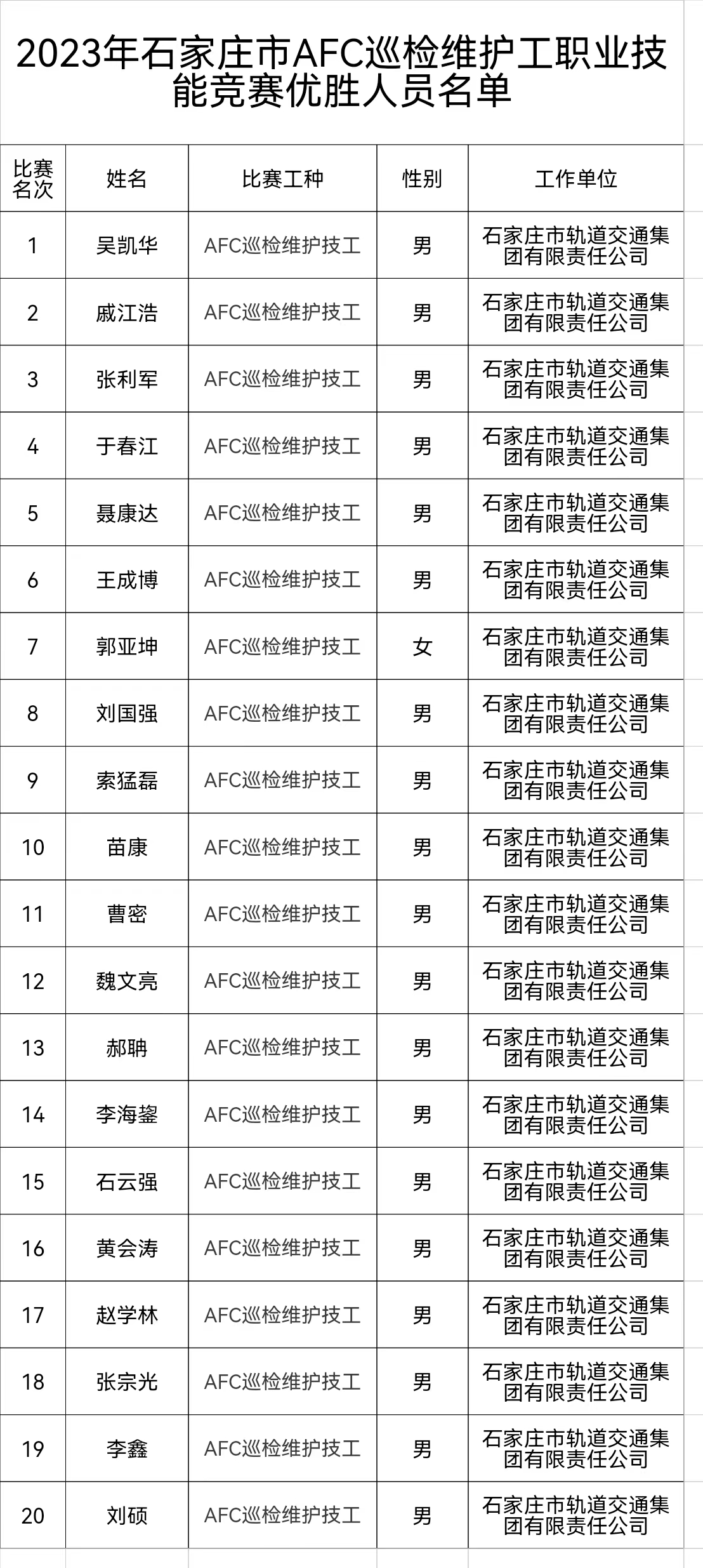 2023年石家莊市AFC巡檢維護(hù)工職業(yè)技能競賽優(yōu)勝人員名單