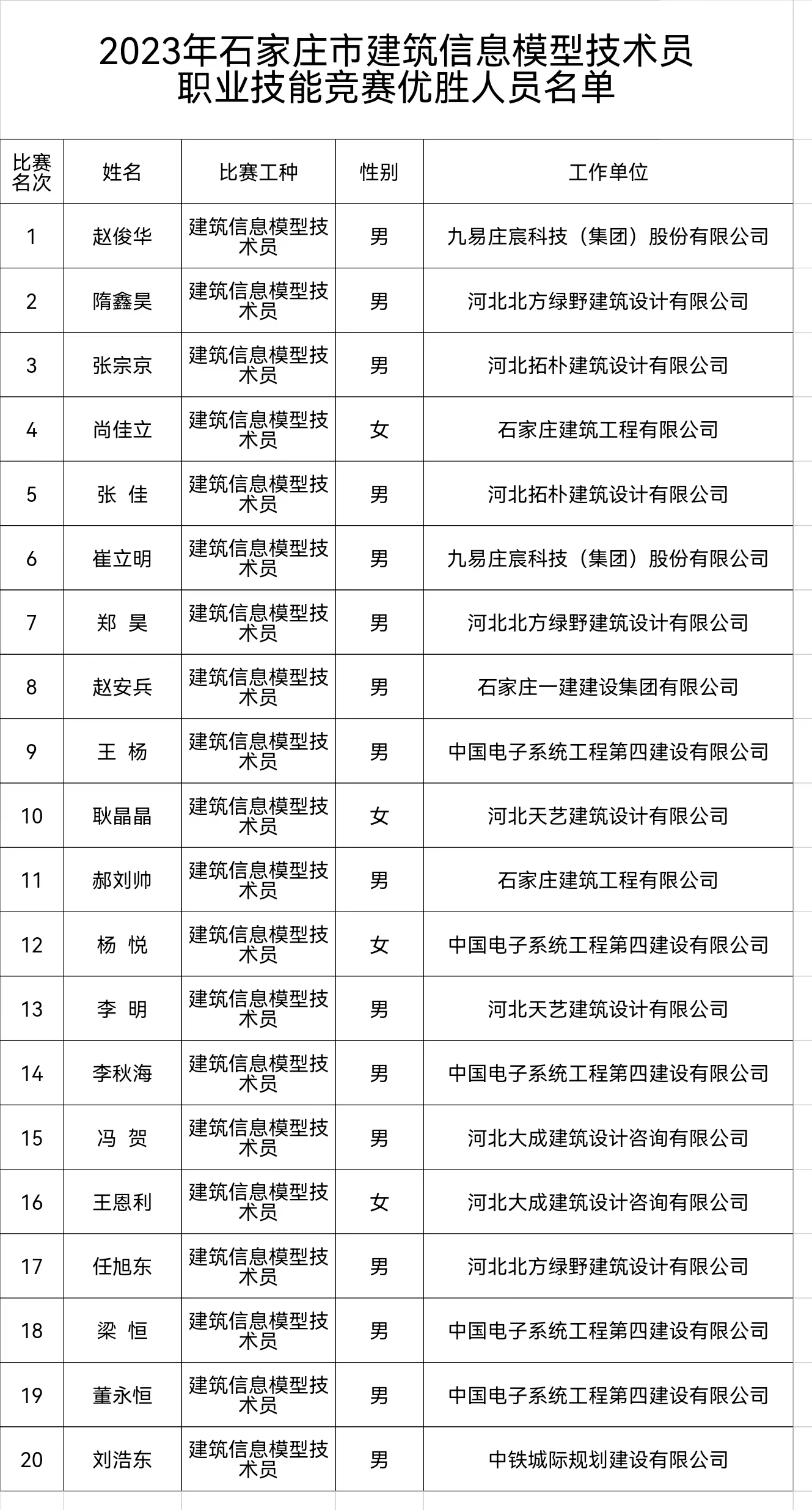2023年石家莊市建筑信息模型技術(shù)員職業(yè)技能競賽優(yōu)勝人員名單