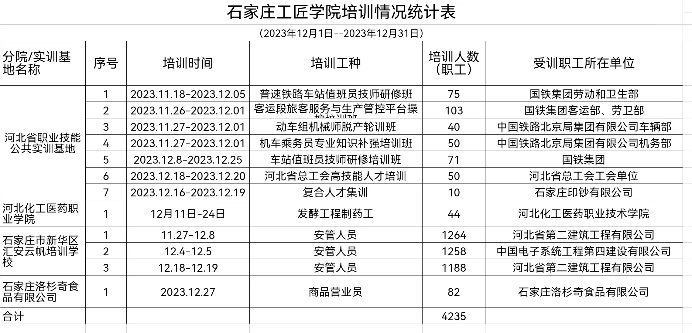 石家莊工匠學(xué)院12月份培訓(xùn)數(shù)據(jù)統(tǒng)計